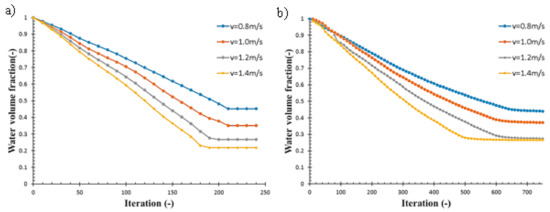 The comparison of the calculation results obtained for both models with the measurements is shown in Figure 9. Both the CFD 3D spatial model and the 2D plain model overstate the amount of water remaining in the installation at the assumed maximum blowing speed of 1.4 m/s. For the remaining blowing speeds, the determined volume of water remaining in the siphon is slightly lower than in reality. Despite some discrepancies between the measurement results and the results obtained from the numerical models of the installation, high values of correlation coefficients were obtained for all analyzed cases.