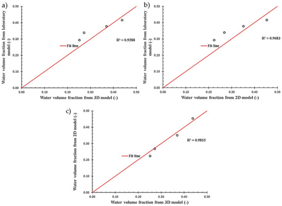 Comparison of modelling results with measurement results: (a) 3D model vs. measurements, (b) 2D model vs. measurements, (c) 3D model vs. 2D model.