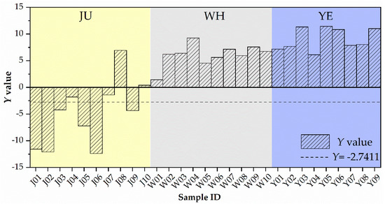 - Discriminant analysis showed, in the JU profile, the range of Y values was −12.37 to 6.94, and most samples were lower than −2.7411, while in the WH and YE profiles, all Y values were higher than −2.7411. This result indicates that the origin of JU plinthosol is aeolian sediments, while in the WH profile and the YE profile, the origin might be alluvial deposition.