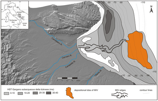 Simplified map showing position of the Manfredonia Incised Valley (MIV) and of its depositional lobe, high-stand system tract (HST) Gargano sub-acqueous delta (gray tones) and bathymetry of the Manfredonia Gulf shelf with 10-m-spaced contours. Redrawn from literature data [29,31,32].