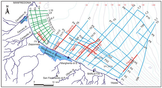 In addition to the surveys described above, this work reports the seismic profile T1, which was acquired and processed within other surveys carried out between 2013 and 2014 using sub-bottom profiler Benthos CHIRP III in the Manfredonia Gulf, immediately NW of the area investigated in the present study (Figure 2). For the technical details of that survey see [32,38].