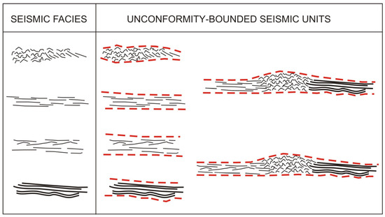 Conceptual scheme of relationships between seismic facies and unconformity-bounded seismic units (UBSUs) applied in this study. The red dashed lines are the unconformity. The symbols of the seismic facies used in this figure are indicative only.