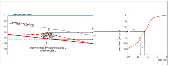 For an approximate assessment of the age of the UBSUs, we have modified the method based on the current depth of the units, already applied in the southern Adriatic (see for example the age estimation made by Maselli and Trincardi [30] for the units 2C and 2D of area 3 of the MIV or the age estimation made by Pellegrini et al. [45] for the Palaeo Gargano compound delta).