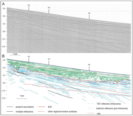 Part of seismic profile T0 (A) and its interpretation (B), showing the erosional surface (ES1) on a regional scale. Note that ES1 is identified as a surface that separates the substrate from younger sediments having a different seismic architecture.