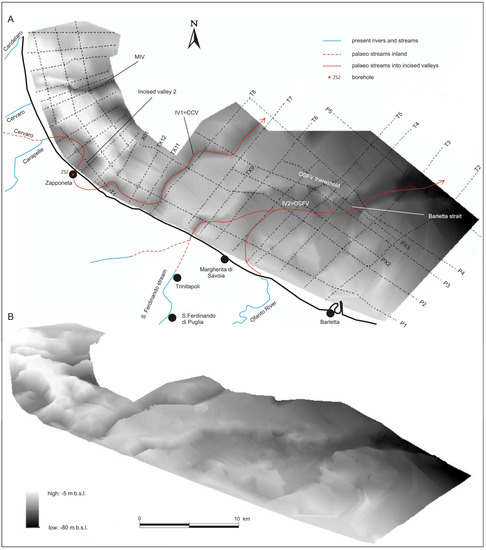 The south-eastern landform is another incised valley (hereinafter incised valley 2: IV2; Figure 6), which appears, in the sector closest to the coast, as two different sub-incisions. These two sub-incisions merge in a single wide and shallow valley with a very rugged and irregular bottom. The IV2 reaches a maximum width of 11.9 km (profile P2) and narrows to approximately 2.5 km in correspondence with the Barletta strait (Figure 6). The IV2 reaches depths between ca. −13/−15 m b.s.l. (profile T4) and ca. −50 m b.s.l. at the Barletta strait; a topographic low is present at the intersection between profiles P3 and T5, where the bottom reaches −48 m b.s.l. With respect to the surrounding ES1, the IV2 shows decreasing depths towards the open sea, between ca. 17 m and less than 10 m b.s.l.