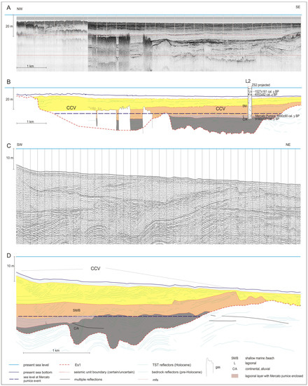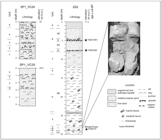 In addition, the level of pumice present from 28.5 to 27.8 m (−27.3 to −26.6 m b.s.l.) was attributed to the eruption of the Mercato Pumice [50] of the Somma-Vesuvius volcanic complex, dated to 8890 ± 90 cal year BP [51,52].