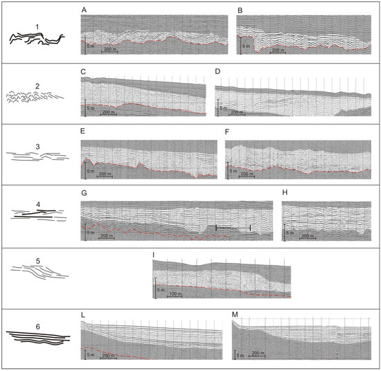 The seismic survey allowed us to identify a regional erosional surface (ES1). In some cases, the ES1 appears as a clearly visible reflector, with moderate to high amplitude, coinciding with a more or less evident angular unconformity between the underlying reflectors and the overlying reflectors; in other cases, the ES1 appears instead as an abrupt contact between very different seismic facies. However, in both cases, ES1 is identified as a surface that separates the substrate from younger sediments having a very different seismic architecture. The substrate is almost always characterised by seaward-inclined reflectors, referable to oblique-tangential clino-forms [39] which dip at low angles (usually fractions of a degree) and are truncated up-dip by the ES1. Sediments above ES1, on the other hand, are highly variable in that they are characterised by numerous seismic facies (Figure 5).