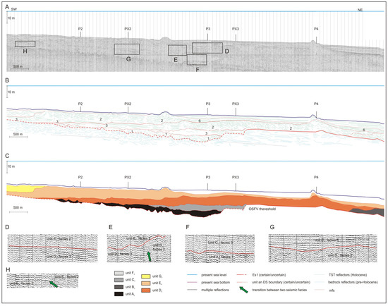 The seismic facies interpretations are also based on two vibro-cores drilled in 2015 in the Manfredonia Gulf: SP1_VC24 (intercepted by profile P2); and SP1_VC25 (close to profile PX2) on behalf of the Puglia Basin Authority (AdB) for a sand resource study of the Apulian continental shelf. The chronological constraint of the transgressive UBSUs is based on a borehole drilled in Zapponeta town (ZS2) in 2012 by the AdB during a seismic microzonation project; this borehole was directly analysed by the authors. Seismic facies, coupled with the identification of discontinuity surfaces, were used to separate the TST sediments into UBSUs. More precisely, UBSUs have been distinguished based on unconformities, interpretable as surfaces of erosion or discontinuity in sedimentation. The UBSUs in some cases are made up of a single seismic facies, in other cases of multiple seismic facies (Figure 3) that transit into one another (i.e., the seismic units described in [17] and [44]).
