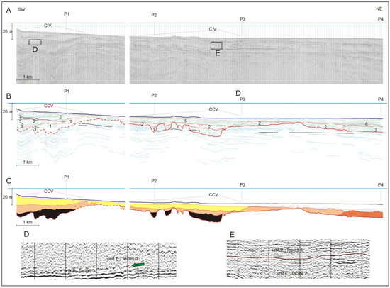 The central is an incised valley (hereinafter incised valley 1: IV1; Figure 6), that reaches a depth (in profiles T8 and P1) of ca. −37 m b.s.l. and ca. 18/22 m below the surrounding ES1. In the P2 profile, the maximum depth is ca. −38 m. b.s.l., which reaches −50 m. b.s.l. in profile P4.