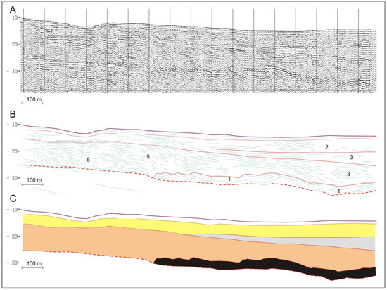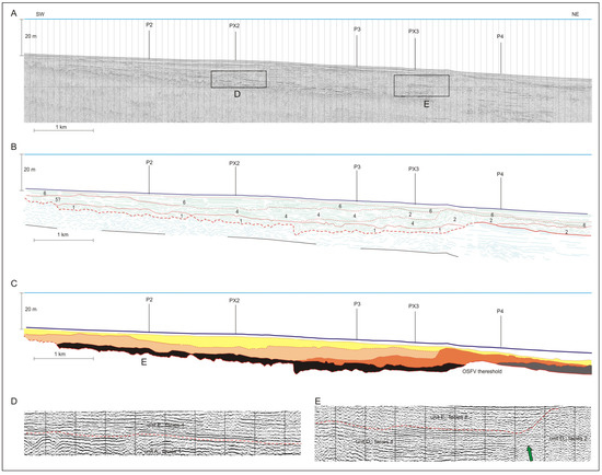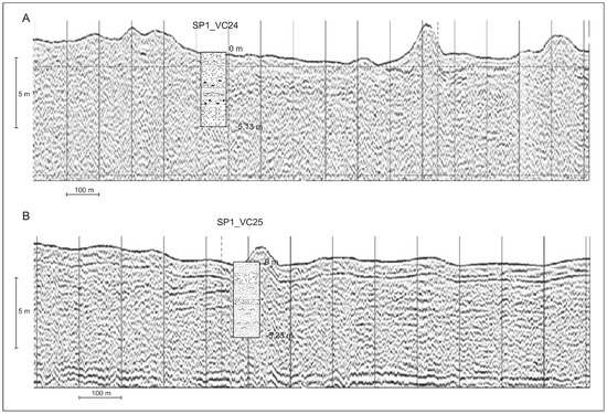 One of the seismic facies (seismic facies 2) was found to be helpful in an approximated evaluation of the age range of the UBSUs. Seismic facies 2 has been interpreted in this study as a high-energy marine deposit and therefore deposited at (or close to) sea level; this interpretation is validated also because the seismic facies 2 is intercepted by vibro-cores SP1_VC24 and SP1_VC25, where it is present between the sea bottom and the bottom of the two vibro-cores. In addition, the interpretation of seismic facies 2 is in accordance with Trincardi et al. [28] (p. 86) which defined the sediments cropping out at the sea bottom in the area were the two vibro-cores have been realised as “proximal transgressive sandy deposits of beach or paralic environment”.