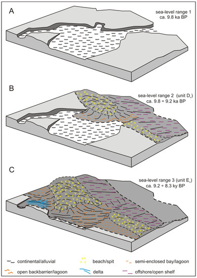 - Storms, J.E.A.; Weltje, G.J.; Terra, G.J.; Cattaneo, A.; Trincardi, F. Coastal dynamics under conditions of rapid sea-level rise: Late Pleistocene to Early Holocene evolution of barrier-lagoon systems on the northern Adriatic shelf (Italy). Quat. Sci. Rev. 2008, 27, 1107–1123. [Google Scholar] [CrossRef]