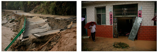 The Guanshan River Basin, located in a rainy area in the Hubei and Henan provinces, is an area with high-incidence local rainstorms. Historically, the area has experienced two disastrous flood events, in 1935 and 1975. The area also frequently experiences the flash flood, mudslide and landslide disasters. On 5 August 2012, a severe flood disaster occurred that caused great harm, as shown in Figure 2. Because the maximum discharge occurred on 6 August 2012, it is also called No. 20120806 flood. The Gushan Hydrological Station in Guanshan measured the rainfall as reaching 287 mm in 28 h from 11:00 p.m. on 4 August to 3:00 a.m. on 6 August, resulting in flooding in the town. Three people died in this flash flood. All the power supply, transportation, communication, and water supply to the 13 villages in Guanshan were interrupted, and the damage to the houses and farmland was serious. More than 50% of houses and almost all the farmlands were flooded. The whole department of highway management in Shifang was destroyed. The disaster, which affected 13 villages, resulted in three casualties, and direct economic losses of up to more than RMB 23 million (about $3.22 million) [13].