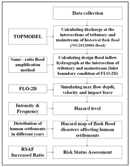 To assess the risk status of flash flood disasters, firstly, a hydrological model was used to generate the inflow hydrograph of designed flood. Secondly, to simulate maximum flow depth, velocity, and impact force, a suitable hydrodynamic model was chosen. In this study, TOPMODEL and FLO-2D were used for hydrological and hydrodynamic simulations, respectively. Based on the results of the simulations, the flood intensity was calculated. Thirdly, in combination with the selected flood frequency, the hazard level was calculated. Fourthly, according to the human settlements in different years, the hazard map of flash flood disasters in human settlements was obtained. Finally, the statistics of the area of different hazard levels were calculated, and the proposed RSAF and increased ratio were used to assess risk status of flash flood disasters in different years. The methodological flowchart is shown in Figure 3.