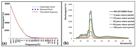 Flood estimation of Guanshan River: (a) frequency curve of peak discharge of Gushan Station in the Guanshan River Basin; (b) discharge hydrograph of a typical flood and the designed flood.