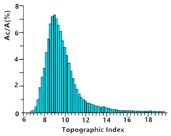 In this study, the data used to extract the topographic index were obtained from the 10 m DEM mentioned above. The main steps for extracting the topographic index through ArcGIS (Environmental Systems Research Institute, Redlands, CA, USA) were as follows: filling DEM, extracting flow direction, calculating accumulation, dividing watershed, and extracting slope. The frequency distribution of the topographic index in Guanshan River Basin is shown in Figure 5.