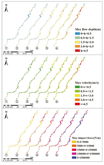 According to the Technical Requirements for Analysis and Evaluation of Mountain Flood Disasters, China [29], considering the actual local situation, the maximum depth h and maximum discharge per unit width q were used to define the flood intensity, as shown in Table 6.