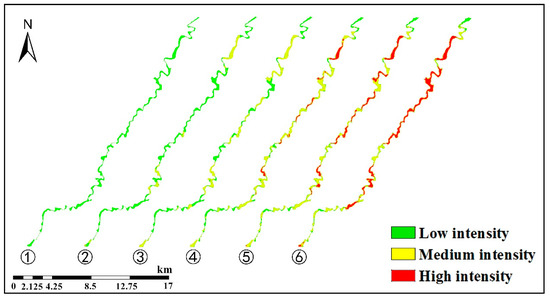 Table 7 shows that the flood with a lower designed frequency is more intense, and the lower designed frequency of the flood may cause a larger proportion of high intensity level. To confirm the flood frequency, we referred to the measurement standard with 5-, 20-, and 100-year return periods. Based on the above-mentioned hazard level criteria, considering the flood intensity of the designed flood frequencies, the hazard distribution of the Guanshan River was calculated. The hazard level distribution was obtained from the calculation of the hazard distribution of the Guanshan River, and then the area of each hazard level was analyzed. The results are shown in Table 8. The hazard distribution map of Guanshan River was obtained, as shown in Figure 8.