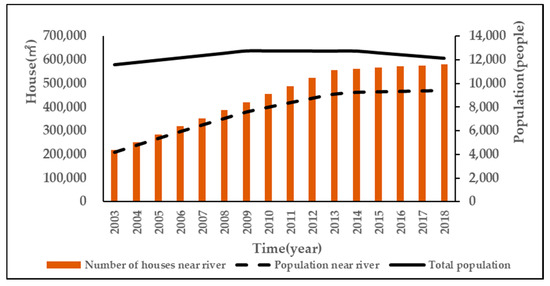 In the past few decades, China’s economy has developed quickly. According to census data, the total population in the Guanshan Basin has fluctuated in the past few years, as shown in Figure 9. The population along the Guanshan River first increased and then declined slightly. Figure 10 shows that houses along the Guanshan River followed the same rule. In the Guanshan River Basin, over time and with economic development, more people who originally lived in the mountains have migrated near to the river to seek better living conditions.