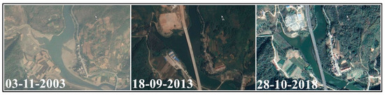 Changes in houses along the Guanshan River in 2003, 2013, and 2018. (Images obtained from SPOT-5 Satellite of Google Earth).
