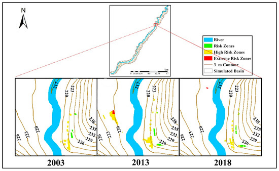 (3) Comparing the population distribution of the Guanshan River Basin in the past 15 years, we found that, in the human settlement, the hazard distribution area has expanded, and the probability of loss and casualty caused by flash flood disasters is increasing, which means that the risk of a flash flood hazard is consistent with the regional development of Guanshan River. According to the RSAF, although the area of extreme risk zones is not large, it has a greater impact on the risk status, due to having the highest risk of flash flood disasters. According to the increased ratio, since 2003, with the development of the regional economy, more residents moved to the risk and extreme risk zones, which increased the overall risk of flash flood disasters. From 2013 to 2018, most likely due to the huge losses caused by the flash flood disaster on 5 August, 2012, local residents moved away from the high risk and extreme risk zones. The findings provide practical guidance for flood control and disaster prevention in the Guanshan River Basin and showed that the risk assessment for the flash flood disasters must be considered when planning the regional economic development, otherwise, development problems may be encountered.