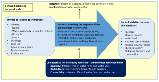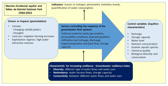 This literature review identifies a number of tools that have been used indirectly to build the application of resilience into hydrogeology: the use of tracers or isotopes to determine groundwater age [27], the analysis of piezometric evolution trends in aquifers [28], and the quantification of water consumption for agriculture in restricted aquifers [29]. Quantification also relies on qualitative indicators as an auxiliary tool [16]. However, the term “resilience” in the hydrogeological literature is presented as an attribute that is not analyzed in itself, but which is frequently cited within the framework of processes (recharge, precipitation) associated mostly with climatic variability, and, to a much lesser degree, with other processes (extreme events).