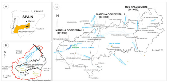 (A) General geographical setting. (B) Upper Guadiana basin. (C) The Mancha Occidental Aquifer (currently divided into three groundwater bodies: Mancha Occidental I, Mancha Occidental II and Rus-Valdelobos) (Source: Authors’ own).