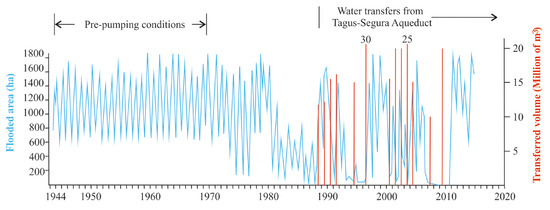 For three decades, the wetland remained in precarious hydrological conditions, with the only exception of rapid floods due to extreme rainfall events and sporadic water transfers from the Tagus river basin. The water transfers from the Tajo-Segura Aqueduct started in 1988 and have often been carried out during spring or summer when evaporation and infiltration rates are highest and when increased demands of water for irrigation promote illegal extractions. Flooding the wetland with pumped groundwater was a management tool used constantly during dry periods to keep a minimum flooded area. Both management tools induce quantitative and qualitative impacts on the system [69].