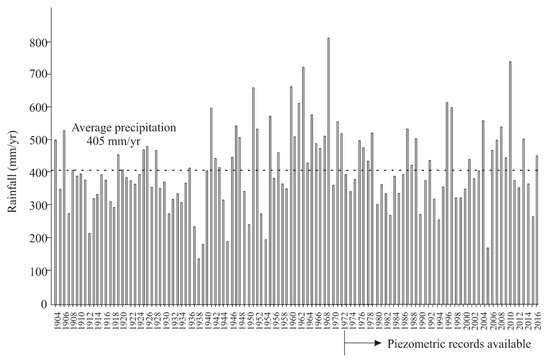 The analysis of the flood data series for the period 1944–1974 (Figure 5), prior to the overexploitation of the aquifer, reveals that in that period changes in rainfall (Figure 6) determined changes in water variability: changes in rainfall determined changes in the wetland surface covered by water [68].