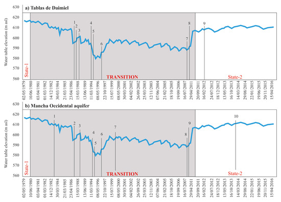 Water table evolution in a representative monitoring well (1930.4.0040) located near the Ojos del Guadiana springs and Tablas de Daimiel National Park. It ranks among the longest available piezometric records. The figure also shows the main historical events occurred in the (a) Tablas de Daimiel National Park: 01/1986–87: peat fires; 02/1987: Tablas de Daimiel was dry up for the first time; 03/1988: the first water transfer from Tagus-Segura Aqueduct; 04/1994: peat fires; 50/1995: flooded area, 30 out of 2000 ha; 06/1996–98: heavy rains; 07/2009: peat fires; 08/2010: water transfer from Tagus-Segura Aqueduct; 09/2012: groundwater feed Tablas de Daimiel. (b) Mancha Occidental Aquifer: 01/1983: Ojos del Guadiana springs dried; 02/1987: provisional declaration of aquifer overexploitation; 03/1988: maximum pumping peak (570 million m3); 04/1994: declaration of aquifer overexploitation (pumping regulation); 05/1995: water level depth 47 m in Ojos del Guadiana springs; 06/1996–98: heavy rains; 07/2000: Water Framework Directive (2000/60/EC); 08/2009: water level depth 35 m in Ojos del Guadiana springs; 09/2010: heavy rains; 10/2014: Declaration of the Upper Guadiana basin’s groundwater bodies (GWBs) at risk of not achieving the good quantitative and chemical status. (Data from [7]) (Authors’ own).