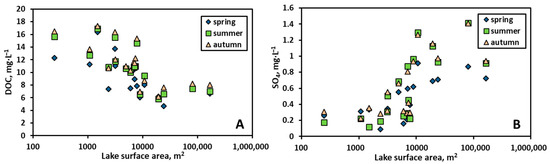 In the isolated permafrost zone, the DOC concentration decreased (Rs spring = −0.72, Rs summer = −0.79, and Rs autumn = −0.76, p < 0.05) in all three hydrological seasons as the water surface area increased (Figure 2A), which can be due to progressive decrease of allochthonous DOC supply from the surrounding peat [18] upon lake surface area (Sarea) increase due to lake maturation. It is known that, when the lake surface area increases, the impact of peat (coastal abrasion) decreases [19]. This is accompanied by a replacement of allochthonous by autochthonous DOC [68,69]. A statistically significant increase in the SO4 concentration in lake water with the increase in Sarea (Figure 2B) during all three seasons (0.76 ≤ Rs ≤ 0.83, p < 0.05) can be attributed to an increased effect of the groundwater and to diffusion of sulfate from sediment porewater, where it accumulates, due to autochthonous organic matter (OM) [32], to the water column. These effects become more pronounced in the course of lake maturation, leading to elevated SO4 concentrations in the largest lakes.
