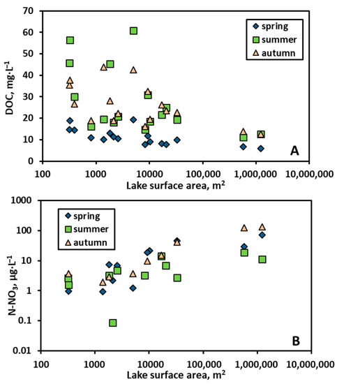 Statistically significant decreases in concentrations with Sarea increase in all three seasons were found only for SC (Rs spring = −0.54, Rs summer = −0.65, and Rs autumn = −0.71, p < 0.05) and DOC (Rs spring = −0.79, Rs summer = −0.51, and Rs autumn = −0.51, p < 0.05) (Figure 3A). The mechanisms responsible for elevated DOC values in small size lakes are peat abrasion and enhanced suprapermafrost water input, with limited processing of allochthonous DOC due to its stability with respect to bio- and photo-degradation (i.e., Reference [70]). Typically, young thermokarst thaw ponds are marked by the presence of organic matter from the degrading permafrost [69]. Another element exhibiting systematic change of concentration over all seasons is nitrite. The N-NO3 concentration increased with Sarea (Rs spring = 0.9, Rs summer = 0.73, and Rs autumn = 0.9, p < 0.05, Figure 3B), which can be indicative of nitrate diffusion from lake sediments, where it is produced due to enhanced input of allochthonous OM from decaying phytoplankton, which is typical for large lakes.