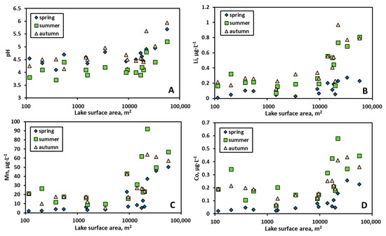 At the same time, the pH and concentration of Li, Mn, and Co significantly increased with Sarea during all three seasons (p < 0.05, Figure 4). Here, both mobilization from groundwater (Li) or lake sediments, due to redox reactions (Mn, Co; see Reference [32]) in large lakes, may be the governing factor of element increase during the baseflow period.
