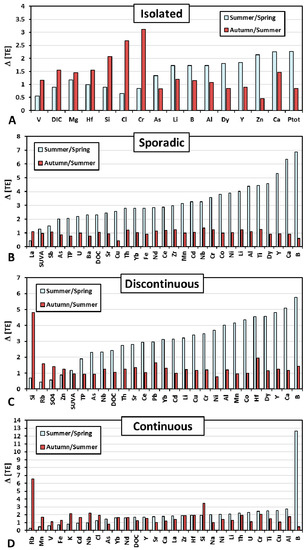 The ratio of concentrations of chemical elements between different hydrological seasons (summer/spring and autumn/summer): isolated (A), sporadic (B), discontinuous (C), and continuous (D) permafrost zones. The diagrams show elements with statistically significant differences recorded for at least one compared pair (p < 0.05).