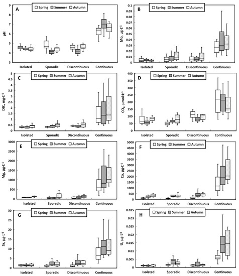 Increase in pH and concentrations of some chemical elements in different hydrological seasons in the permafrost profile of Western Siberia: pH (A), Mo (B), DIC (C), CO2 (D), Mg (E), Ca (F), Sr (G), and U (H).