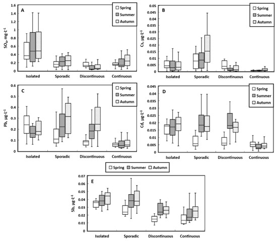 (2) Elements decreased their concentrations northward in all three seasons (p < 0.05): SO4, Cd, Pb, Sb, and Cs (Figure 8). The decrease in SO4 may be due to isolation of sulfate-bearing groundwater reservoirs from surface waters occurring in the continuous permafrost zone. Trace elements Cd, Pb, Sb, and Cs are known to enrich the peat and peat porewaters [49,50], and their decreased concentration in the north may reflect a decreased release of these elements to adjacent surface waters due to decreased peak thickness in the continuous permafrost zone [3]. Furthermore, a decreased input of these elements to the lake water in the north may be due to a decrease in the impact of atmospheric aerosol deposition [20].