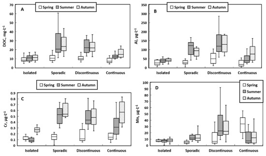 (3) The elements which did not show statistically significant changes with latitude in all three seasons (p < 0.05) were SC, Cl, DOC, P-PO4, N-NO3, N-NH4, B, Al, Si, K, Cr, Mn, Zn, As, and Rb. However, some elements such as DOC, Al, Cr, and Mn demonstrated a clear maximum in the sporadic or discontinuous permafrost zone (Figure 9). Presumably, this permafrost belt with its highest ALT during summer and autumn baseflow and at the same time sizable amount of frozen peat provided the most optimal redox conditions for Mn (and Cr) mobilization from the lake sediments to the water column and DOC and Al leaching via peat abrasion and transport in the form of colloids [60].