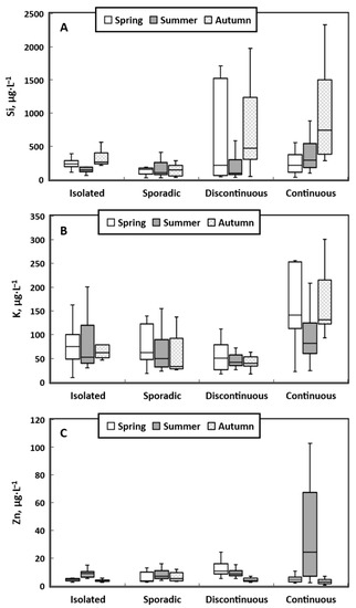 Elements that showed a sharp increase in concentrations in the discontinuous and continuous permafrost zones during individual seasons: Si (A), K (B), and Zn (C).