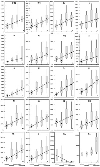 The degree of excess of summer over spring pool of DOC, DIC, and many trace elements (Li, B, Na, Mg, Al, Si, Ti, Cr, Ni, Sr, Ba, Se, Zr, Sb, REEs, Th, and U) in lakes increased northward. The overall increase ranged from 200% to 400% (Figure 11). Note the quite low Rsummer/spring of most elements in the isolated permafrost zone; this indicates that the main source of these elements can be lateral transfer to the lakes as a result of decomposition of plant litter during active snowmelt and rather minor inflow in summer. In this permafrost zone, the most significant decrease (20% to 80%) in Rsummer/spring value occurred for DOC, DIC, Se, Na, Mg, Al, Ti, V, Cr, Mn, Fe, Co, Ni, Cu, Rb, Sr, Zr, Cd, Sb, Ba, light REEs, Pb, Th, and U.
