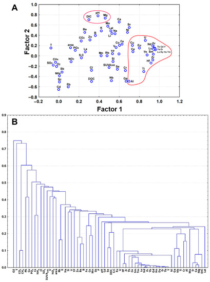 Principal component analysis (PCA) (A) and HCA (B) treatment of dissolved elements and studied parameters of lake waters during all seasons.
