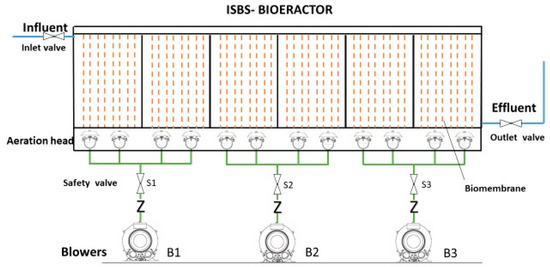 ISBS reactors are highly efficient. The effluent water quality in these reactors is more stable than that in moving-bed and rope-bed biofilm reactors [30,31,32]. ISBS reactors are effective in COD removal and have higher efficiency in removing ammonia nitrogen compared with magnetic activated sludge sequencing. The performance of these reactors is much better than that of conventional sequencing batch reactors [33] and mixed membrane bioreactors. ISBS reactors require a small amount of water retention time but exhibit high COD and ammonia nitrogen removal efficiency [34]. The main indicators of effluent water quality meet the Class A emission requirements of the Pollutant Discharge Standards for Urban Sewage Treatment Plants (GB 18918-2002): COD ≤ 50 mg∙L−1, NH3-N ≤ 5 mg∙L−1, SS ≤ 10 mg∙L−1. ISBS reactors are more efficient than other reactors that are modified based on conventional biochemical methods [35,36].