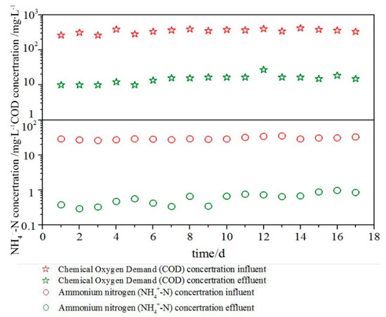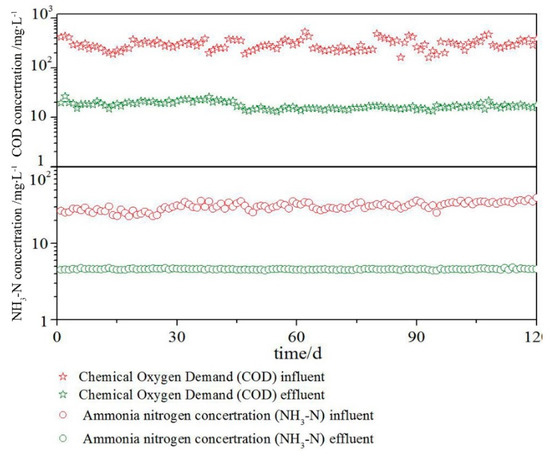 The ISBS reactor was operated for over 365 days. The HRT of the ISBS reactor was 14 h, and the quality of the inlet and outlet water for 120 days is shown in Figure 2. The water COD concentration was 278 ± 255 mg∙L−1, and ammonia nitrogen was 14 ± 12 mg∙L−1. As shown in Figure 2, within 120 days, the quality of the inlet water became increasingly obvious, but the effluent water quality was stable. The effluent COD concentration was 19 ± 7 mg∙L−1, and the ammonia nitrogen was 0.33 ± 0.15 mg∙L−1.