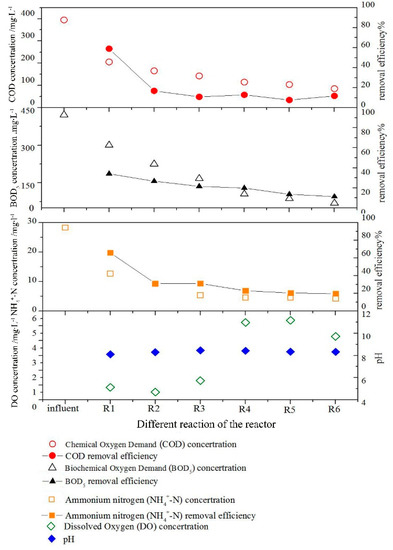 Figure 4 shows the changes in COD, BOD, N-NH4+, DO, and pH on a random day during the short-term stable operation of the ISBS reactor. The COD concentration in each reaction zone (R1–R6) continuously decreased, and the influent COD concentration was 395 mg∙L−1. The COD concentration in the six reaction zones was 171, 125, 102, 68, 54, and 23 mg∙L−1, and the final effluent was 23 mg∙L−1; these results indicate that the COD concentration deceased by 56.70%, 11.6%, 5.8%, 8.6%, 3.5%, and 7.8%, respectively, compared with the influent concentration. The total COD removal rate of the ISBS reactor reached 94.2% because the effluent from each reaction zone was the influx of the next zone.