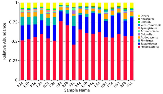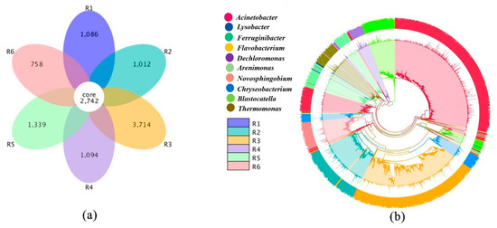 We used the PyNAST method [47] and mapped phylogenetic relationships and evolutionary trees of representative sequences (Figure 6). Each interval had the same core community, and the species richness of the R3 interval was high (Figure 6a). Bacterial communities, such as Proteobacteria, Bacteroides, and Firmicutes, were observed, and their levels were mainly reflected in Acinetobacter, Flavobacterium, and Ferruginibacter (Figure 6b). Figure 6b has three layers. The innermost layer is a phylogenetic tree constructed based on the evolutionary relationship of representative OTU (operational taxonomic units) sequences. The different colors represent the corresponding genus levels. The second layer is the relative abundance of OTUs, and is represented by the column height. The outermost layer is the out-annotated credibility distribution, and the column height represents the confidence of the annotation. Acinetobacter is mainly involved in biodegradation, and it can remove several kinds of organic and inorganic man-made waste [48] and polyphosphorus [49]. The intracellular enzyme produced by Flavobacteria participates in enzymatic degradation of the polycyclic aromatic hydrocarbons phenanthrene and anthracene [50], indicating that Flavobacteria facilitates the degradation of environmental and food contaminants. Ferruginibacter is often the dominant species in membrane bioreactors [51]. The microorganisms cooperate with one another in an inert carrier to form the core of the ISBS reactor.
