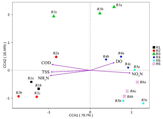The different colors in Figure 7 represent the samples grouped into intervals (R1, R2, R3, R4, R5, and R6), and a, b, and c represent the upper, middle, and lower levels of intervals, respectively. The arrows denote different environmental factors. The length of the arrow connection represents the degree of correlation between an environmental factor and the community and species distributions. The longer the connection, the greater the impact of the environmental factor. These results indicate that COD, TSS (Total suspended solids), NH3-N, and NO3-N had an intense effect, whereas DO had a minimal effect. R1, R2, and R3c were affected by COD, TSS, and NH3-N, and R4, R5, R6, R3a, and R3b were obviously affected by DO and NO3-N environmental factors. Moreover, DO and NO3-N were negatively correlated with COD, TSS, and NH3-N.