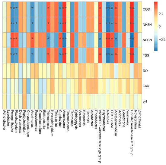 Microorganisms positively related to COD, NH3-N, and TSS, such as Acetanaerobacteria (Figure 8), can hydrolyze gelatin and esculin and ferment several monosaccharides, disaccharides, and oligosaccharides [52]. Christensenellace and Acetanaerobacteria have the same correlation with environmental factors, and other studies have indicated that Christensenellace is positively correlated with digestible dry matter and digestible organic matter intake [53]. Anaerovorax, which is positively correlated with COD, NH3N, and TSS, is an organic anaerobic chemical nutrient bacterium [52]. Studies have shown that the functions of microorganisms are related to their correlation with environmental factors. If the content of organic substances, ammonia nitrogen, and TSS is high, then microorganisms will have sufficient “food” and be able to survive and reproduce easily. By contrast, these microorganisms are negatively correlated with NO3-N because a decrease in ammonia nitrogen is accompanied by an increase in NO3-N content and a decrease in COD and TSS. An increase in NO3-N content indicates that “food” that is positively related to COD, NH3-N, and TSS is no longer sufficient, and the living environment has undergone adverse changes. Meanwhile, other microorganisms, such as Nitrospira and Cupriavidus, that are positively correlated with NO3-N have a good living space. Nitrospira is the main nitrous acid oxidizing bacteria in wastewater treatment [54], and its growth and reproduction must be accompanied by an increase in NO3-N content. After the consumption of easily degradable organic pollutants, Cupriavidus, a microorganism capable of degrading hydrazine and removing metal ions [55], exhibits room for growth.