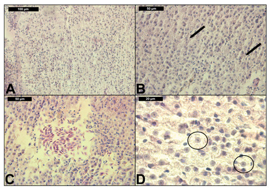The results from the conducted histological study are presented in Table 2 and Table 3, as well as Figure 1 and Figure 2. In the control group, we observed relatively normal liver morphology (Table 2, Figure 1A). The hepatic structure was characterized by compactly arranged hepatocytes disposed in a simple layer aligned with sinusoids. The parenchyma itself was primarily composed of polyhedral hepatocytes, typically with central nuclei, with densely stained chromatin margins and a prominent nucleolus. We also observed the pancreatic mass, which was situated around the branches of hepatic portal veins. In addition, the pancreatic mass consists of two parts, which are the exocrine and endocrine. Exocrine cells are larger and elongated, while endocrine cells are smaller and round. The morphology of the exocrine cells shows that they are arranged in an acinus form with a distinct nucleus, while the endocrine cells are scattered in between the hepatic portal veins and the exocrine pancreas. Moreover, the venous blood entered the liver caudally from the intestine via the hepatic portal veins, and branches into capillaries known as sinusoids; the sinusoids were lined with reticuloendothelial cells, which were in turn surrounded by hepatocytes (see [58]).