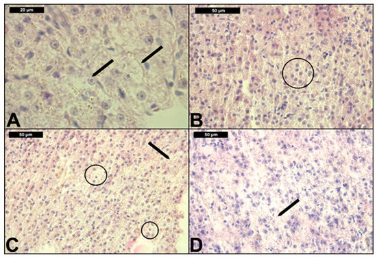 With regard to the regressive liver lesions (Table 2), we found granular (Figure 1B and Figure 2B) and vacuolar degeneration (Figure 1D) in the highest degree of expression. As shown in Table 2, all concentrations induced the same level of granular degeneration. Moreover, vacuolar degeneration showed a tendency towards an increase in the degree of expression with the increased CPF concentrations. We did not find fatty degeneration in the hepatocytes (Table 2 and Table 3). Necrobiotic changes, such as karyolysis, karyorrhexis and karyopyknosis (Figure 2D) were found mainly in a mild form of expression. At the higher CPF concentration, these changes were expressed in a moderate degree, which, in turn, demonstrates the highest degree of degenerative processes leading to necrosis. In addition, we also found necrosis in a moderate degree at the highest CPF concentration (Figure 2C). We also observed structural alterations in the interstitial tissue in a mild degree of expression. With regard to the progressive alteration in the common carp liver, we observed hypertrophy in a mild degree at the lower CPF concentrations, while, at the highest concentration, this histological lesion was expressed in a moderate degree.