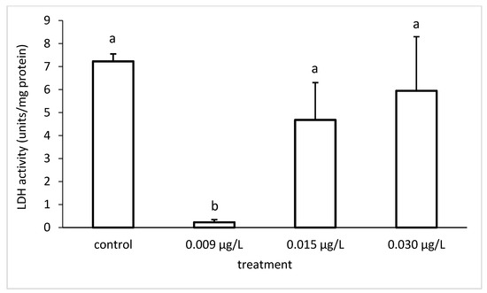 We found an increase in the LDH specific activity with increasing insecticide concentrations. However, the LDH specific activity differed significantly among the different groups (ANOVA F = 22.33; p < 0.001) (Figure 3).