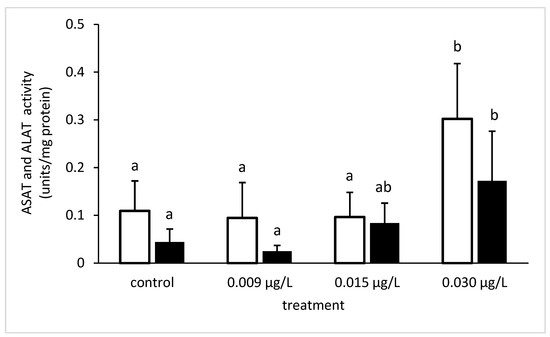 Aspartate aminotransferase (ASAT) (white bars) and alanine aminotransferase (ALAT) activity (black bars) in common carp liver under different CPF exposures. Bars represent means ± SD of the control and experimental groups. Different letters indicate significant differences among treatments (p < 0.05).