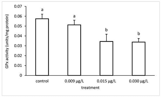 Glutathione peroxidase (GPx) activity in common carp liver under different CPF exposures. Bars represent means ± SD of the control and experimental groups. Different letters indicate significant differences among treatments (p < 0.05).
